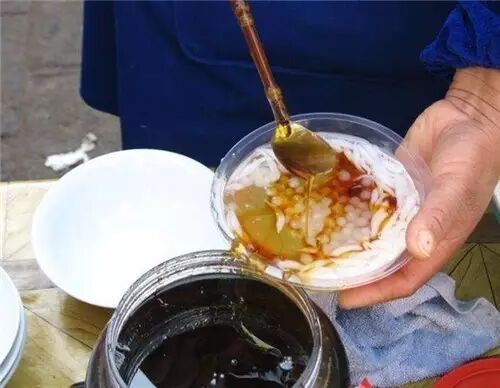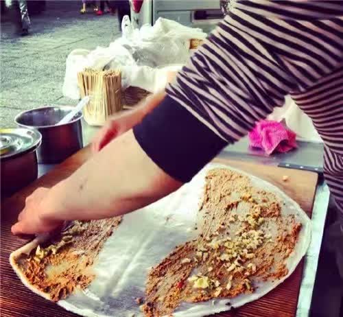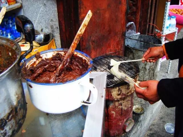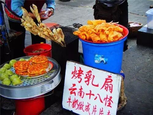 古城里最多的小吃是烤乳扇,简直是见缝插针的摆摊,烤得大多焦焦糊糊的,搁冷了以后,很硬,刷上炼乳只能当棒棒糖吃。要是碰到刚烤出来的,“泡泡”的那种,又另当别论,确实是好吃。