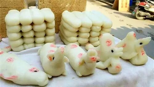 做成各种生肖的形状,热气腾腾的时候应该是能吃的,凉了以后似乎是摆设,早期可能是祭祀用品。