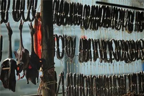 安昌古镇的腊肠挂过几天以后,就越来越黑,这黑呢又还不是黑暗料理的颜色黑,它是一种馋人的黑,黑中带亮,亮的是五花肉里的油水,经过盐巴的腌渍一层层润到外面来,在肠衣外面包裹出的一层“腊皮”。