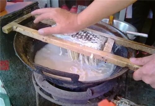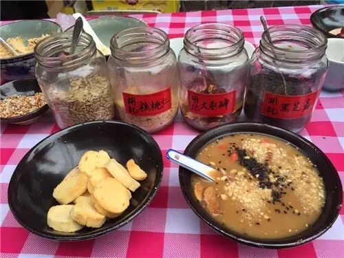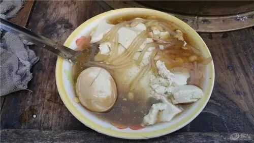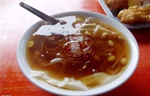 平遥的豆腐脑以卤子见长,里面有粉条、豆子等,加料熬成卤水,吃的时候以卤水垫底,加上鲜豆腐脑,搅合着吃。甜豆腐脑地区的同学,这个就是你需要挑战的。