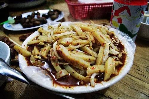 类似于凉粉糕,制得以后,冷却使其凝固,切块或是切条,拌上陈醋、蒜泥、辣椒、香菜等搅合开,吃起来酸爽开胃,非常过瘾。加蔬菜、鸡蛋,炒着吃也不错。