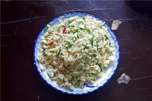 用土豆丝或圆白菜丝等,裹面粉蒸熟,抖散以后,用番茄炒,用鸡蛋炒着吃的面食。