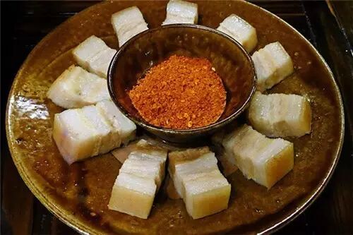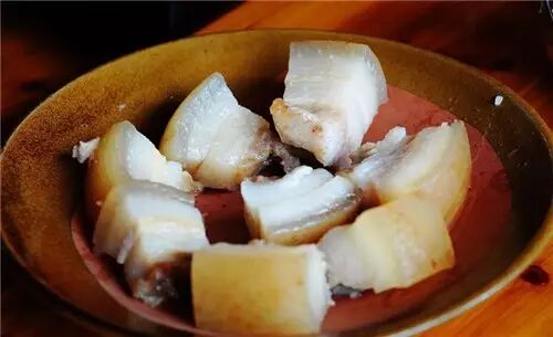 五花肉有的是新鲜的,有的是用盐巴爆腌过的,西南地方的杀猪菜里大多有这么一道肉块菜。以前吃起来过瘾,现在吃起来太腻。