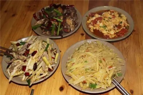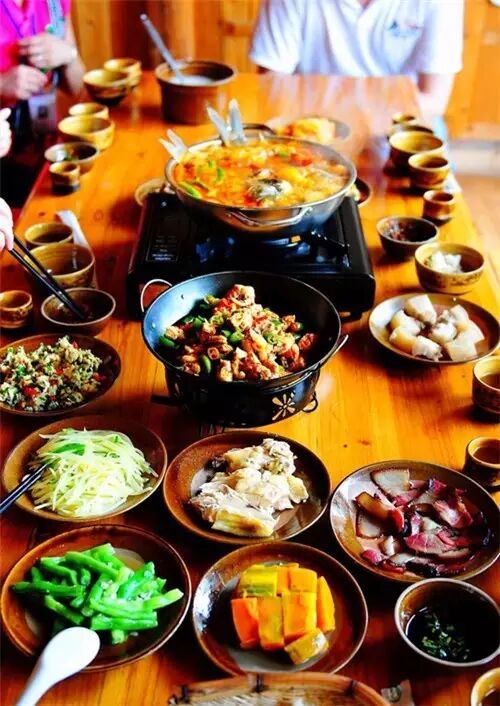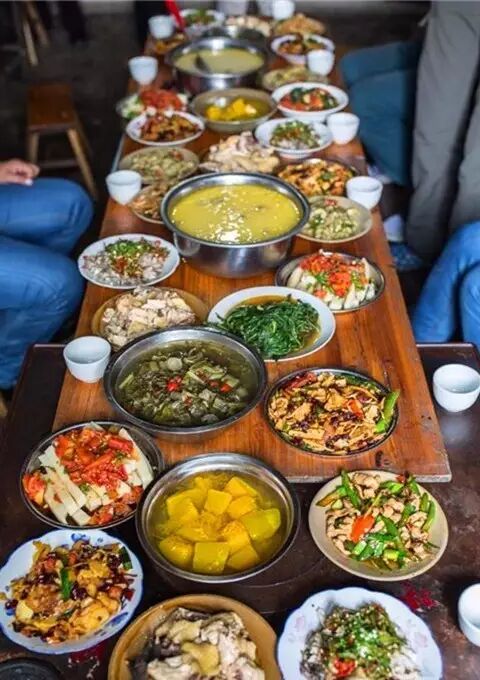 肉切成方块,肉片炒蒜苗或是葱姜辣椒,蔬菜简单清炒或是水煮,凉拌菜用时令蔬菜或是野菜拌一大盆,拌料是“擂”碎的青红辣椒、花椒、干辣椒包、山胡椒等,酸味菜荤素皆有,腌酸鱼、酸汤菜、酸肉,大碗小碗摆满长桌的各个空隙,看起来就过瘾。