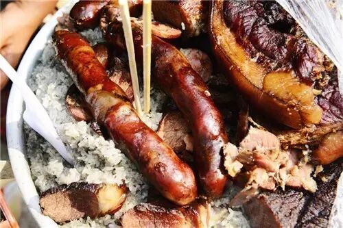 说起来是苗寨特有的黑猪肉菜,以前很难吃到,要在苗族的节庆,而且是几年一次的盛大节庆上才能吃上那么一次。现在苗寨里卖的鼓藏肉大多就是普通五花肉,一大坨在白水里煮熟,捞起来切成大方块,蘸着胡辣子干料或蘸水吃。