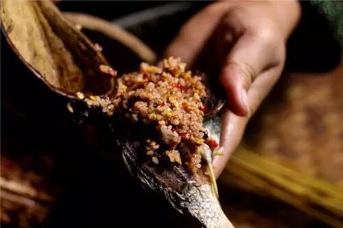 苗王鱼就是在蒸鱼或是烤鱼上铺上一层擂好的辣椒作料。味道极香辣,一定要一块鱼肉裹着一层作料吃,才过瘾。