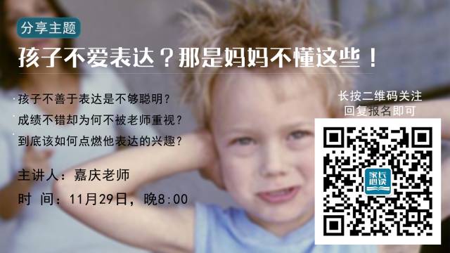 妈妈们总是为孩子不爱说话、不善表达着急,到底原因出在哪?下周二晚8点,听专家为你细细解答。长按下方二维码,回复“报名”即可参加
