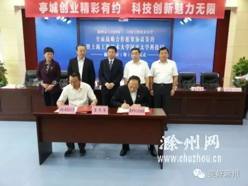 滁州市人民政府与上海工程技术大学全面战略合作框架协议签约暨上海工程技术大学国家大学科技园滁州园区(筹)揭牌仪式在滁州市高新技术创业服务中心举行。市委书记姚玉舟,上海工程技术大学校长夏建国出席仪式并为上海工程技术大学国家大学科技园滁州园区(筹)揭牌。