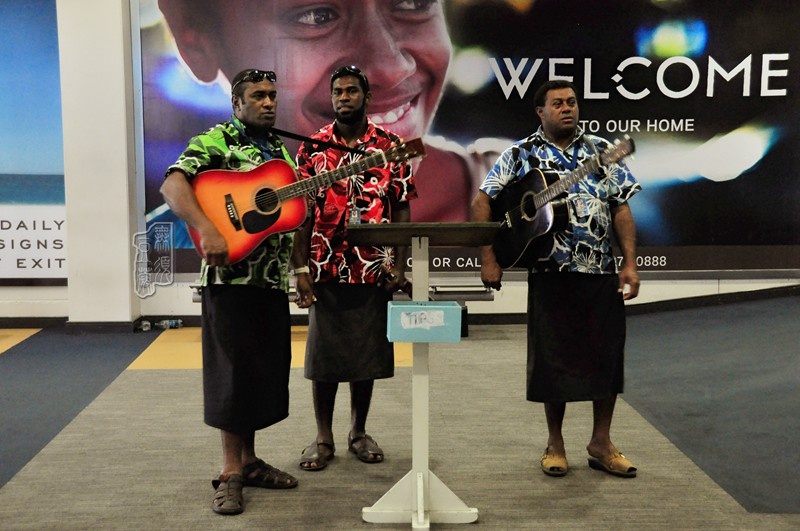 当然迎接我们的,不只是斐济的蓝天白云和热浪,还有斐济人的热情和歌声。在楠迪机场,每一架航班降落,都有人在机场大厅用他们的歌声,欢迎旅客的到来。让来到这里的人,最先感受到斐济的一种文化“歌声”。