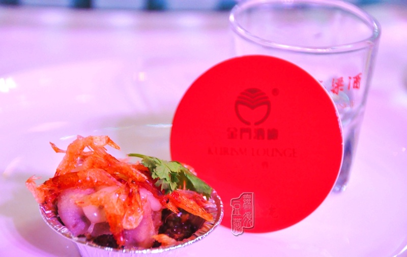 3年窖藏金龙醇和老酒,适合搭配微辣的菜肴,全世界仅台湾东港和日本静冈县出产的樱花虾,配以皮蛋,青辣椒,豆豉,花椒油,这道椒汁樱花虾芋酥配上3年窖藏金龙,那感觉就如花朵在口中一层层绽放。