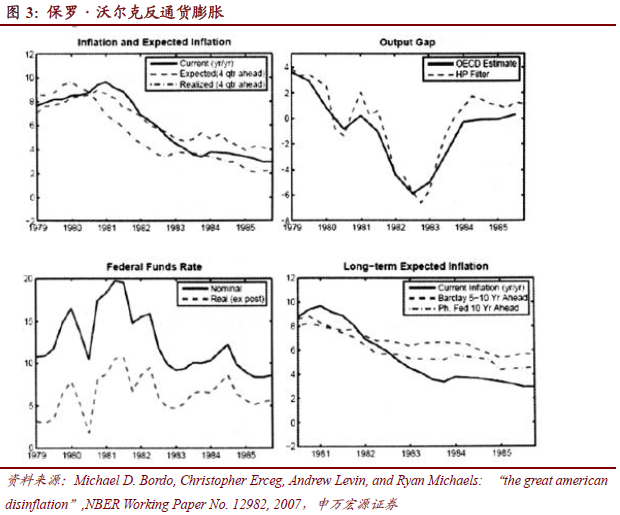 在金本位制度环境下,政策制定者在拥有透明度高和可信度强的长期名义锚上具有优势,而沃尔克(Volcker)在这方面已经不具备这一优势。因为沃尔克(Volcker)抵制通货膨胀的政策是在这样一种环境下施行的,即政策制定者在是否有意愿和能力维持低通货膨胀率方面存在着高度不确定性。美联储在20世纪70年代和80年代初由于缺乏明晰的经济目标而受到指责。因此,即便美联储公布了其长期政策目标(即3%的通货膨胀率目标),也由于其有着这20年的不令人满意记录,使得这一长期目标不具备很强的说服力。因此,可以认为沃尔克领导下的联邦公开市场委员会(FOMC)不太可能在不以较大产出为代价的情况下控制通胀预期来达到低通胀率目标。