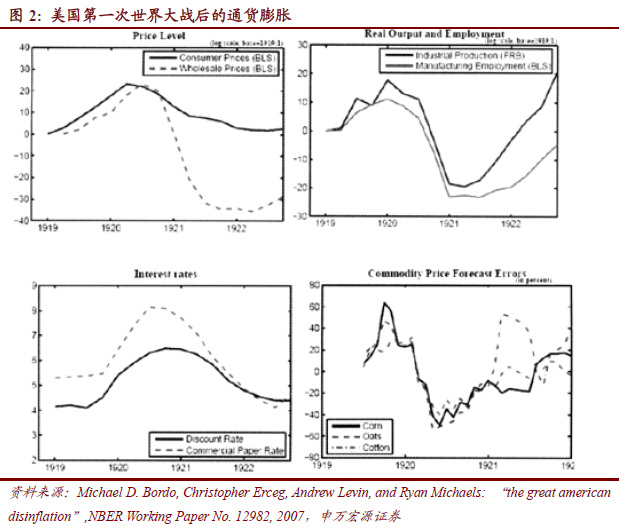 与南北战争后的那段时期类似,一战以后,当政者对金本位的支持似乎是毋庸置疑的。到二十世纪二十年代,金本位的地位还是受到美国乃至国际的捍卫,即便那些经历了更为严重战时通货膨胀的国家也期望恢复金本位。然而,两个时期在采用紧缩政策的方式上存在不同。这个时期美联储采取了激进的通货紧缩政策,而与此相反,在1869年到1879年间的政策则是相当缓和的。这个时期,美联储中有影响力的政策制定者,包括本杰明斯特朗(BenjaminStrong)也认为最重要的就是尽快降低美国参战后造成的通货膨涨;同时,他们也承认这可能会引起产出的显著下降,但这种产出下降的衰退应该是暂时性的,并且不会导致长期的通货紧缩(Meltzer2003)。因此,即便会导致价格水平骤降,政策制定者也将名义利率保持在一个较高的水平上。传统的金本位原则主张在严重的通货紧缩和大量黄金流入时降低利息率。而这一时期所采取的政策与传统的原则相背离,通过对真实利率的影响,创造了一个活跃的“衰退”。