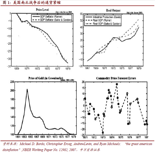 总之,1869年到1879年间,美国通货紧缩的治理是富有成效的,政策的最终目标是透明和可信的,总体价格水平的走势也较为清晰。此外,政府花了很大的气力减小通货紧缩对实体经济的负面影响,并且在可预期的通货紧缩环境下成功实现了金本位制度。