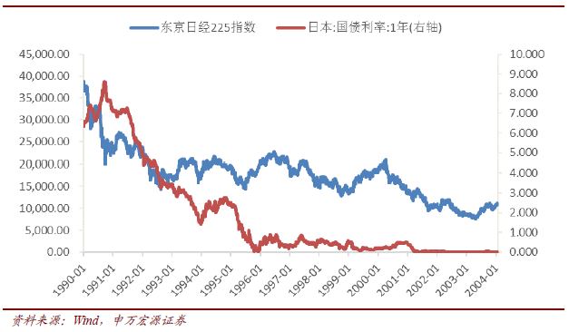第三阶段(2000-2003):在日本共计实施多次经济刺激方案失效后,日本进入长达4年的严重通缩状态。这一时期日经指数再度下跌超过60%。因为此时盈利的下降完全对冲了流动性的上升。同时,这一阶段国债资产又重新上涨,成为表现最好的品种。