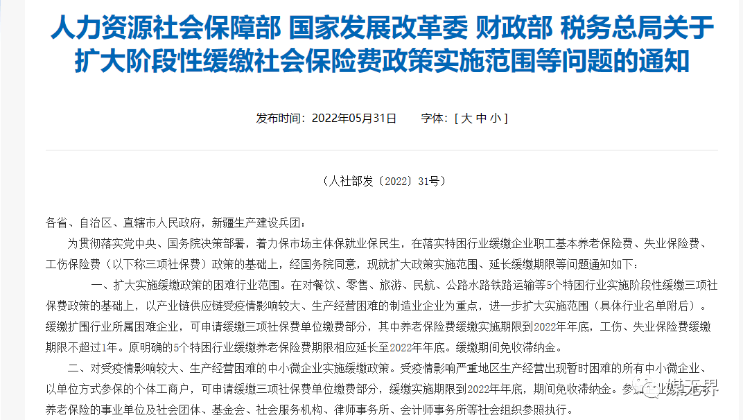 5月31日,人社部等四部门发布《关于扩大阶段性缓缴社会保险费政策实施范围等问题的通知》,将广播、电视、电影和录音制作业等17个其他特困行业纳入阶段性缓缴养老、失业、工伤保险费政策实施范围。其中养老保险费缓缴实施期限到2022年年底,工伤、失业保险费缓缴期限不超过1年。缓缴期间免收滞纳金。