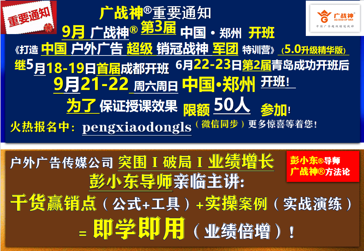 (更多实战实操实用首创原创精彩干货分享欢迎您和您的团队莅临彭小东导师线下公开课广战神®第3届9月21-22日中国郑州《打造中国户外广告超级销冠战神军团特训营(5.0升级精华版本)》课堂。小班授课,名额有限,火热争抢报名中)。