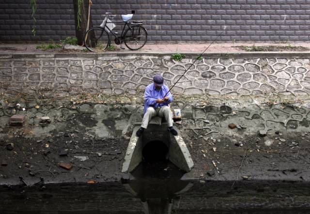 10、北京中部一条受污染的小水渠,一个人在垂钓。
