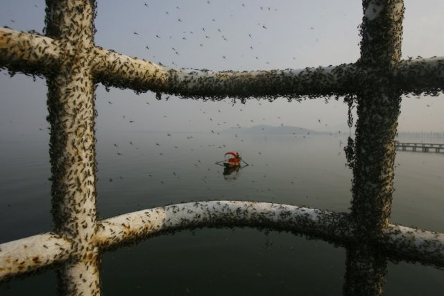 20、2009年11月,湖北武汉东湖,由于湖水污染,难闻的气味吸引了很多蚊蝇。