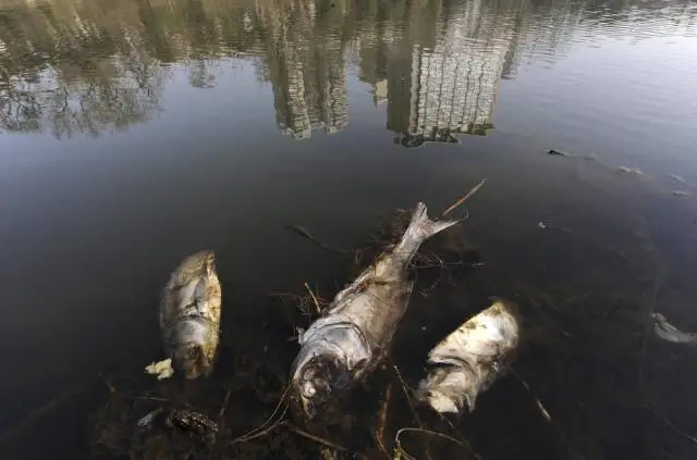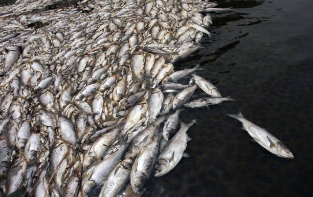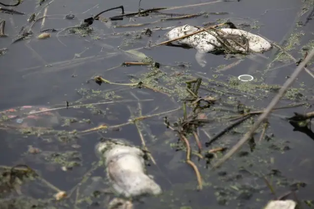 12、安徽合肥一条被污染的河流上见到的死鱼。