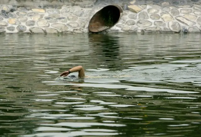 22、2007年8月16日,北京,一名男子在被藻类萌生污染的水渠里游泳。