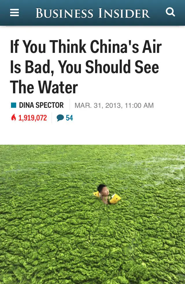 美国科技网站Business Insider刊登过一组中国水污染的照片,标题叫《如果你觉得中国的空气脏,你应该去看看那里的水》。