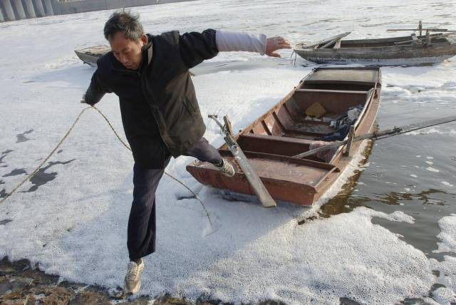 23、2007年3月8日,安徽合肥,一位渔民在一条污染河流里捕鱼归来。