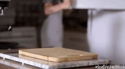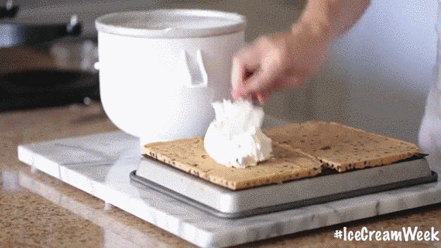 3 拿出来凝固好的摊平的饼干,把冰淇淋挖出,厚厚的抹在饼干上
