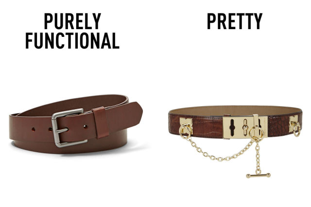 大多数人对待功能性配饰都睡只看功能性,但当他们真的要向珠宝一样提升整体格调。事实是,如果你衣服剪裁合身其实是不需要带配饰的,但你选择带上一个,是因为真的喜欢带。不幸的是,质量优异,材料好的很少有便宜的,但如果你可以花100美元买个项链倒不如花同样的钱买个腰带。它其实就是你腰间的项链。