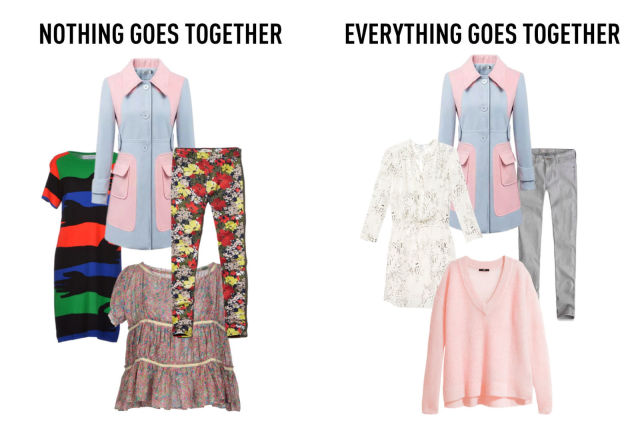 真正世上的人总是能在某一个固定品牌哪里得到大部分她们想要的东西。这听起来似乎有一点无聊,但出自同一设计师之手的衣服往往能够更容易地搭配在一起。如果想的话你可以将衣服混搭在一起,但这感觉不是你想有的。人们知道的唯一方法是你告诉她们你从头到脚穿的都是Club Monaco。