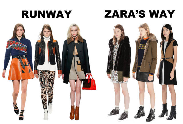 ZARA特有一套可怕的服装仿制方式让服装和饰品有一种高档名牌的感觉。即使奢侈品品牌的公关有时也不能清楚地说出它与奢侈品牌的单品的区别,但这就是它时尚的公开的秘密武器——一点PRADA,一点CHANEL以及很多自我。