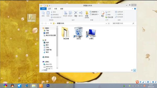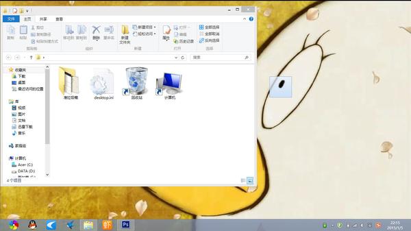 个人感觉,要达到高端的感觉一是要简洁,二是让别人看上去不知道怎么用而只有自己才晓得其中的门道,于是首先我把桌面能删的图标全删了,然后在win8系统的个性化选项里把桌面的系统图标全隐藏了,只在桌面放一个文件夹里边放上常用的快捷方式(避免为了装逼而导致的过分使用不便),如下图