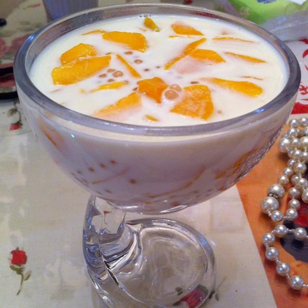 原料:芒果、西米、椰汁、牛奶、蜂蜜。
