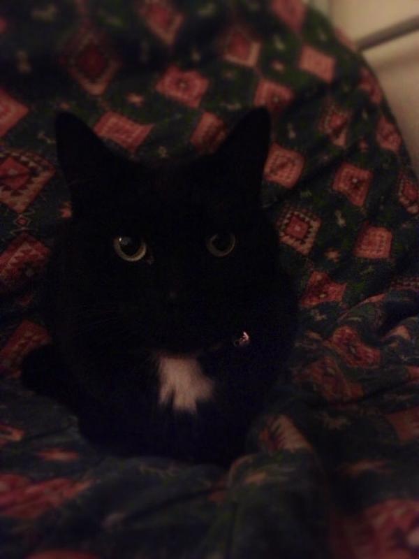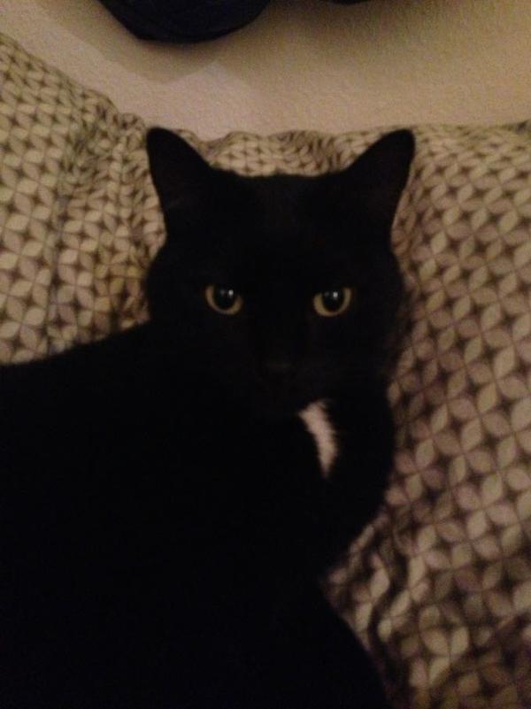 四天过后,在家门口坐公交车,看到站牌的柱子上贴着一张纸:发现一只有V字型白领的黑猫,联系电话xxxx。心中一惊,去电询问一番,我彩信过去noinoi平常照片,人家说对的就是她,你来领走吧。
