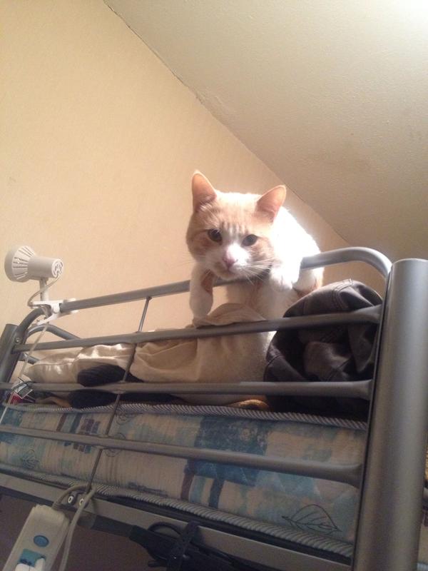 后来几个月,我朋友也领养了一只黄色大花猫,叫Veka,两岁公猫,极度害怕出门,但是喜欢蹲在朋友家二楼的窗台上学鸽子叫,平常说话也从来不是喵,是介于呜~~嗷~和猫~之间的声音。不知道是哪个星球来的猫咪。http://pic4.zhimg.com/7e564fcce24e2cb9d21467320bdf9f69_b.jpgveka喜欢这样趴在朋友的上铺上看朋友玩游戏以及俯视我们这些二脚怪。