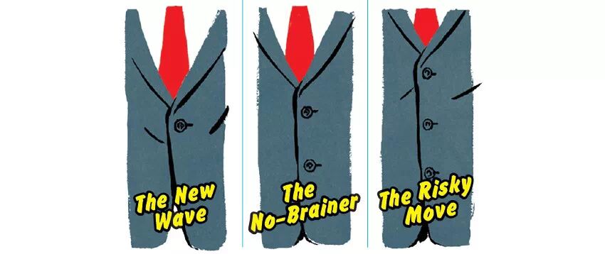 大部分西装外套的衣领都是像两座山连绵再一起,然后沿线渐渐没入外套之中,这种样式是美式西装里面一种非常安全的选择。在衣领部分可有一段有菱有角的设计,拉高下衣领的尾巴,变成向下箭头的造型,可以看起来会更加利落、有型,是来自于欧洲的新潮流。
