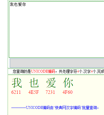 显然熟悉汉字unicode的大概已经看出端倪了。下面这组比较像一对汉字的unicode.然后,既然一共八个字节,四个字。本着喜大普奔的原则,我第一个想到的就是我也爱你。那么下面到了见证奇迹的时刻了。