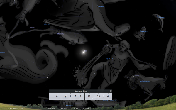 比如今天2月12日,是水瓶座(1·20~2·18),还有一个星期就到双鱼座了。在模拟星图上可以看得很清楚,太阳背后是水瓶座的范围,天球从左往右移,再过一个星期就移进双鱼座的范围了。