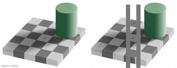 在此之上,一个色块和周围色块的对比也会造成认知的不同,比如这个著名的例子中,AB两处的物理颜色是一样的,但是感知上,B处明显是白色,而A处明显是黑色:
