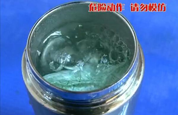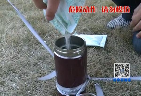 不到半分钟,白色液体开始从杯盖处溢出。随着一阵烟雾,杯盖飞到10米多高,保温杯里面液体喷溅出来。http://pic4.zhimg.com/1ffbf7b0948fad761f7efbd95b5d2327_b.jpg实验结论:没有受潮的干燥剂,放进保温杯兑水后拧紧,的确有可能爆炸。尤其是对好玩的儿童来说,危险更大。