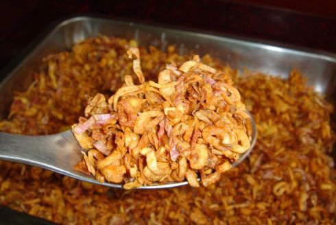 红葱头_切丝后炸成金黄,就像炸蒜酥或是炼葱油一样,焦糖化后会有种很特殊的香气,但很容易炸过头,就成焦苦味了,要十分注意,它可是占着香味中举足轻重的地位;