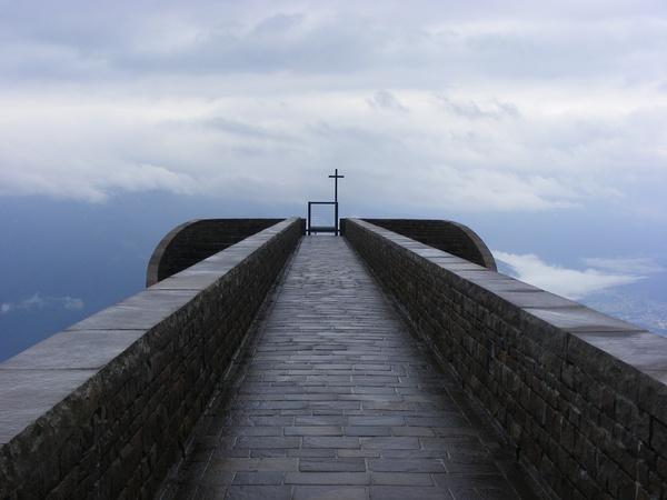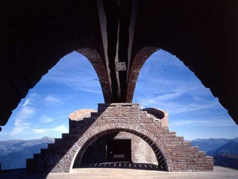 这座10米高的小教堂由100多层钢板加上2000多块钢柱组成。由于小教堂位于一片山丘上,从不同的角度可以观察到不同的形象。比如在低处可以看到一个很厚重的体量,然后将视平线继续上移,会发现小教堂渐渐溶解,直到消失在茫茫景色之中。