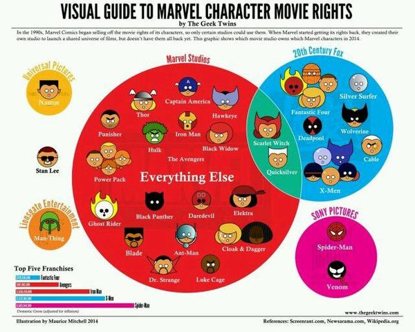 关于快银的版权问题,楼上已经有大神说出原因了,不过我想随着神奇四侠的上映,这个问题又要重弹,这里直接上图划清漫威家目前四分五裂的版权格局
