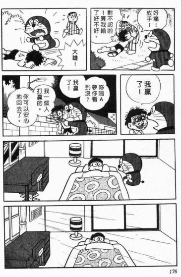 胖虎称赞大雄的勇气,但一下就把大雄打倒,但大雄不服输要再继续打,又被胖虎打飞出去,大雄说他一定要靠自己的力量打赢,这样哆啦A梦才能放心回去,这时回到家仍找不到大雄的哆啦A梦,再度出门去找大雄,终于在空地看到遍体鳞伤的大雄死抓着胖虎不放,胖虎被抓得很痛受不了,最后只好认输之后逃走了。不支倒地的大雄,跟哆啦A梦说,“你看到了吧,我靠自己的力量打赢了”哆啦A梦看到了非常感动泪流满面,并赶快把大雄送了回家。