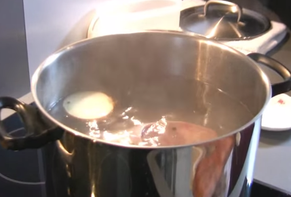 部位见图13)洗净,由于德国黑猪腥味太大,这里教大家一个妙招,把洗好的肘子(不用切)和对半切的洋葱一起放到锅里,放几粒胡椒,放些许盐巴,炖煮两个小时。图4加的是水,但是为了彻底出去腥味,使肘子更加香醇,这里楼主建议全加啤酒