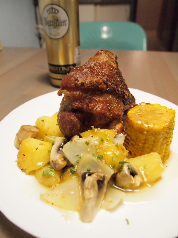 正宗的做法当然是肘子配Sauerkraut(徳式酸菜)还有Kartoffelknödel(土豆球)。照片中的配菜是因为楼主当时冰箱里刚好有些剩菜,就一起放进烤箱里烤制,并且按个人口味调制了些酱汁淋上的结果。