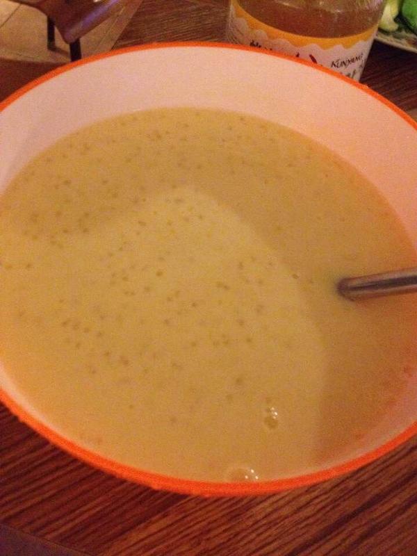 西米君已经在冰箱里躺着了,把他拿出来。那么椰奶加热加糖,冷却,一把泼到西米君脸上,开吃!