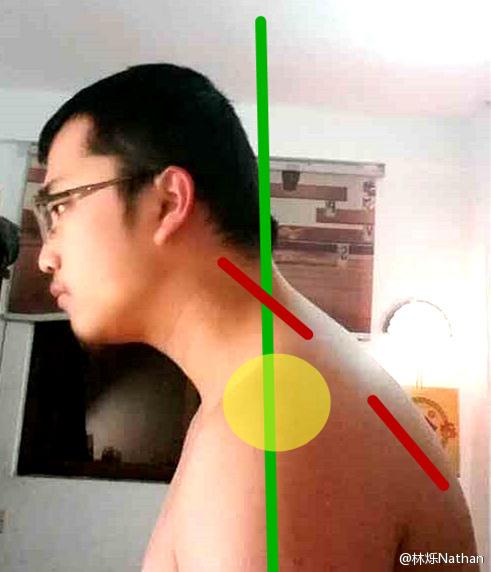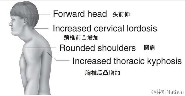 1,胸段伸肌-胸椎后凸-头向前 2,胸大肌/胸小肌-圆肩