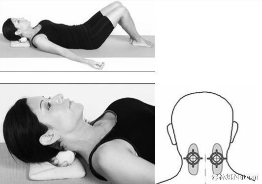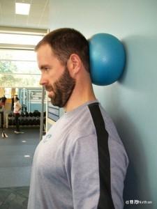 将花生球,或是网球置放于颈部后侧,进行滚动放松。