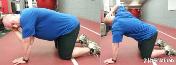 http://pic1.zhimg.com/db5e669648718fa6bf7e19d26e7cb514_b.jpg以右侧为例,上身向右侧微扭转,将泡沫轴放在右胸外侧的位置右手伸直于肩上方,掌心向上;左手肘屈90度支撑于地面右腿伸直,左腿膝屈髋屈90度支撑于地面左手用力,带动身体向上移动,使泡沫轴滚动至胸部略