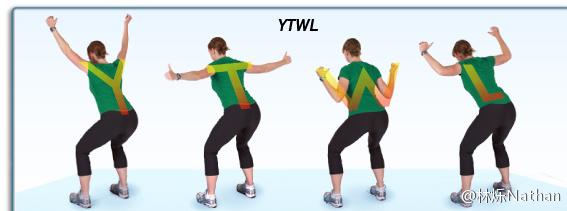 动作流程:1.运动员姿态站立-----屈膝屈髋各90度,膝关节位于足尖正上方,抬头挺胸收腹立腰。2.大拇指朝上,水平侧平举至大写T,后转至Y,最后收至W。依次完成动作若干次。